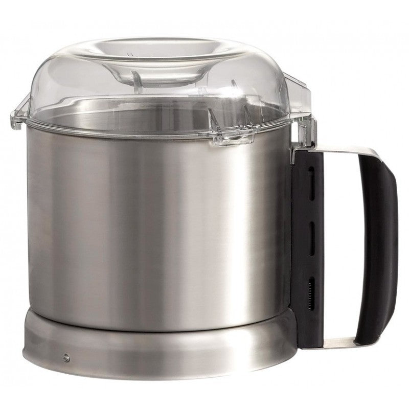 The new vegetable preparation attachment consists of a lidded vegetable preparation bowl. Both the bowl and the lid can be removed for cleaning.